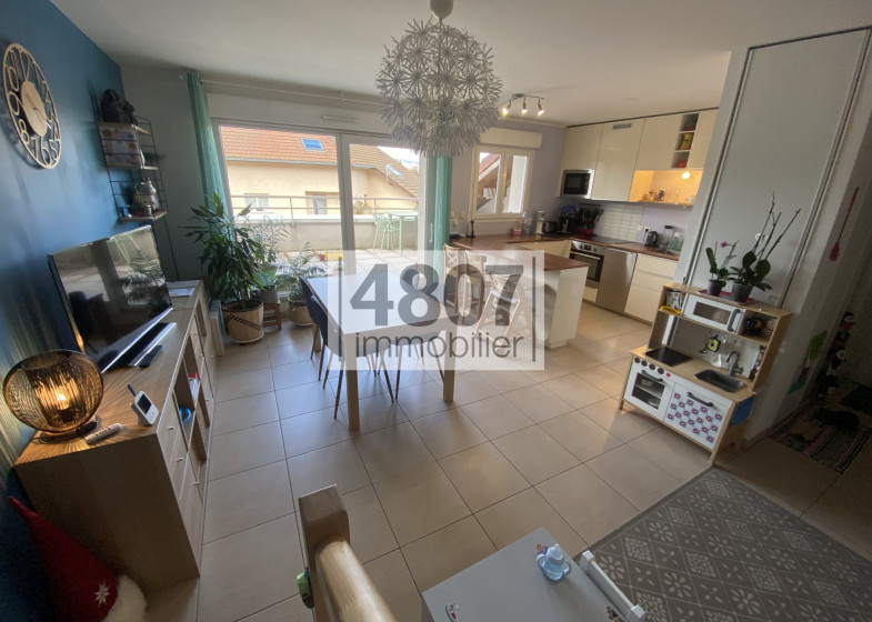 Spacieux T4 lumineux de 102 m2 au dernier étage, vue dégagée sur le Salève, exposition sud/ouest. Cuisine équipée ouverte sur sa grande pièce de vie c...